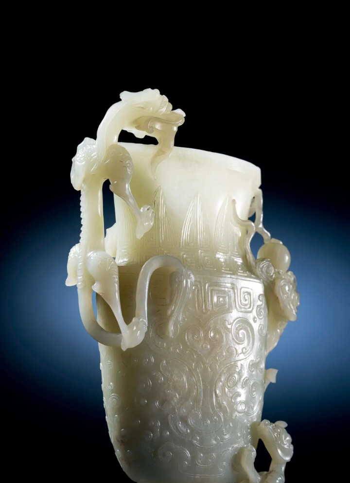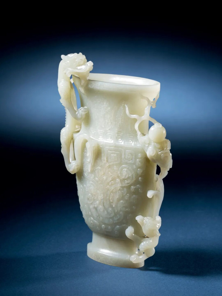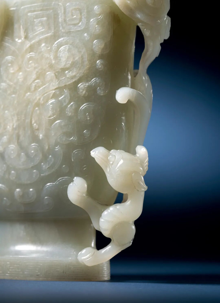 Lot 2193 清乾隆 白玉螭龙耳瓶 H 20.7 cm 估价:RMB 380,000-580,00 1.WalterN.Rothschild夫东说念主(1896-1987)保藏。 2.1963年赠予布魯克林博物馆,布魯克林(馆藏编号63.6.55)。 参阅:故宫博物院藏,乾隆款白玉双螭纹瓶,故00103583。 这件白玉蟠龙瓶,取材“骊龙护珠”与“带子上朝”。瓶身有一大一小两龙讨好,大龙盘踞瓶口,鳞须萧洒,抬头环视;小龙自底仰望,独角初萌,憨稚可儿,旁有流云托举宝珠,意境天真。 另一件白玉好汉炉,以蟠龙为顶,象首为足,寓意“太平有象”;飞熊作耳,神鹰为饰,秀雅“好汉盖世”。合座造型郑重,意蕴祥瑞。